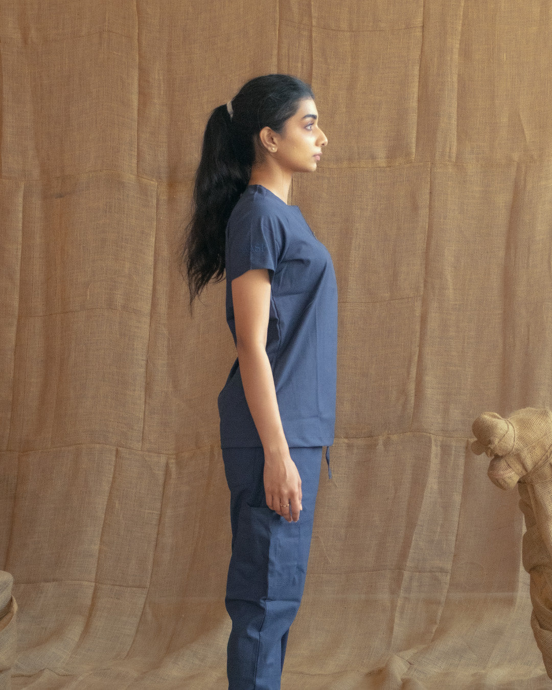 These scrubs are crafted for everyday wearability, combining clean design with thoughtful function. The top features a refined half-zip neckline—structured enough to look sharp, yet soft enough to sit comfortably against the collarbone. Cut with short, easy sleeves and a relaxed, gently contoured fit, it allows full range of movement without excess fabric. A single chest pocket is finished with the signature WASP insignia, embroidered in tonal thread for a subtle, uniform finish.