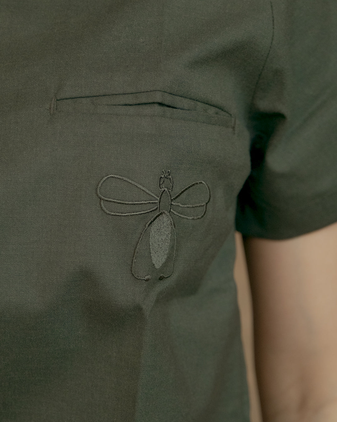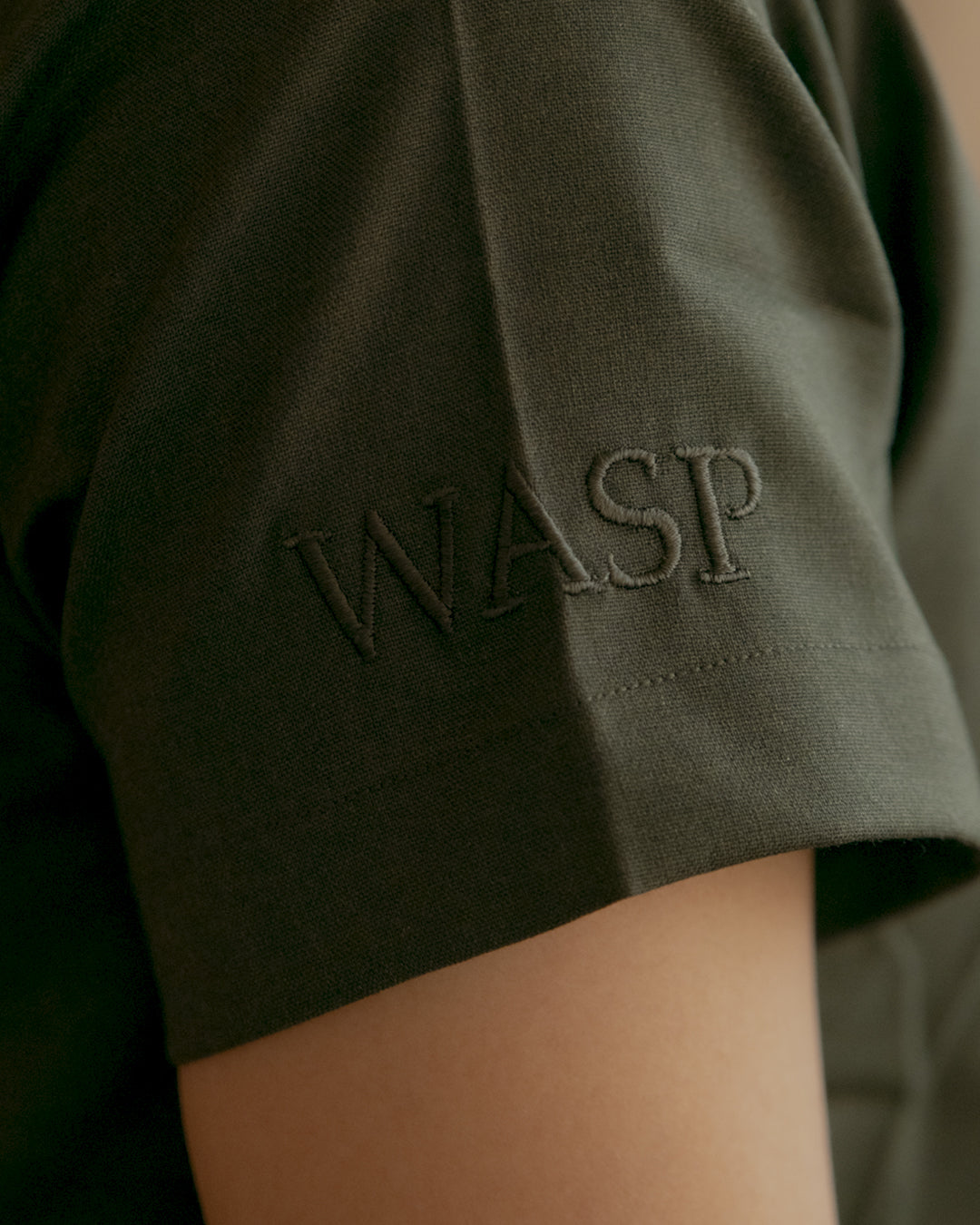 These scrubs are crafted for everyday wearability, combining clean design with thoughtful function. The top features a refined half-zip neckline—structured enough to look sharp, yet soft enough to sit comfortably against the collarbone. Cut with short, easy sleeves and a relaxed, gently contoured fit, it allows full range of movement without excess fabric. A single chest pocket is finished with the signature WASP insignia, embroidered in tonal thread for a subtle, uniform finish.